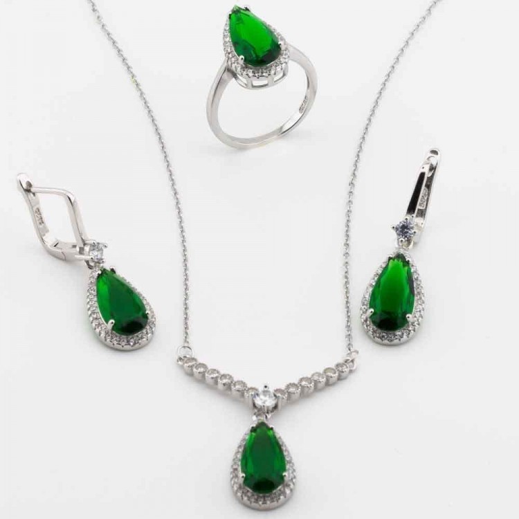 925 Ayar Gümüş Yeşil Zirkon Taşlı Damla Model Set